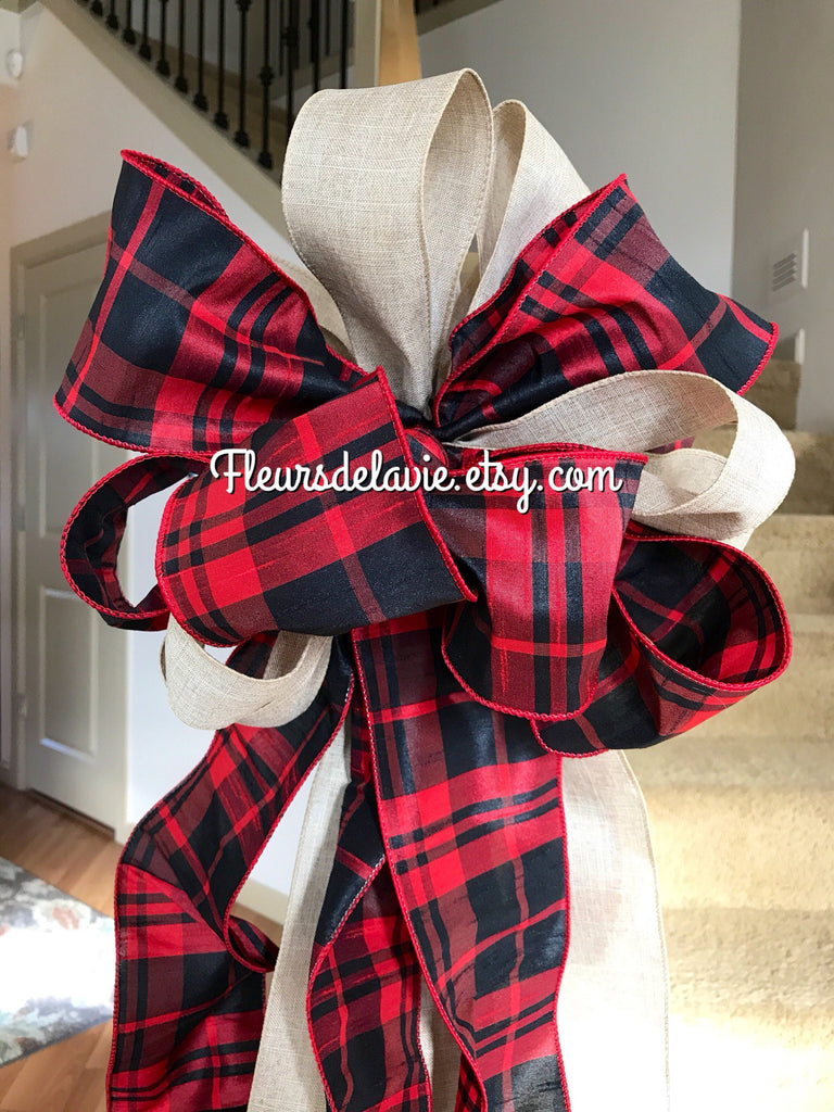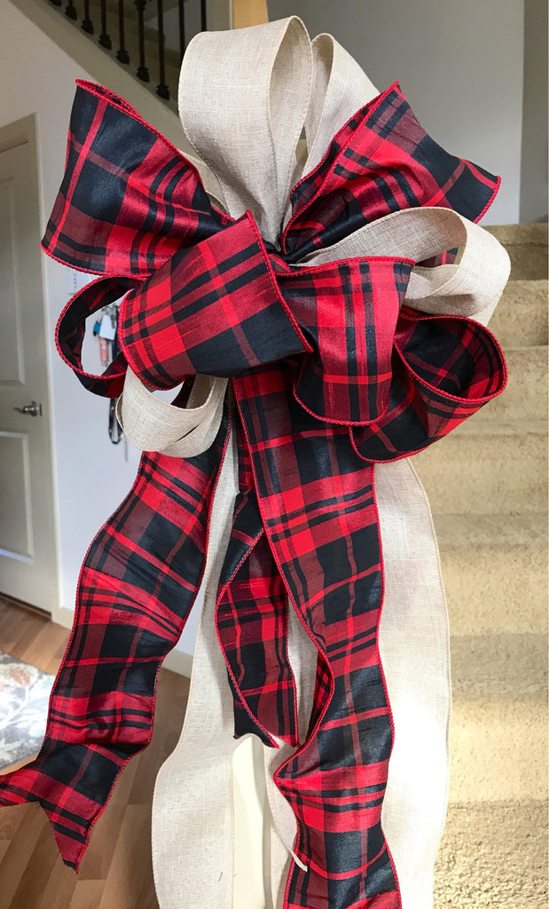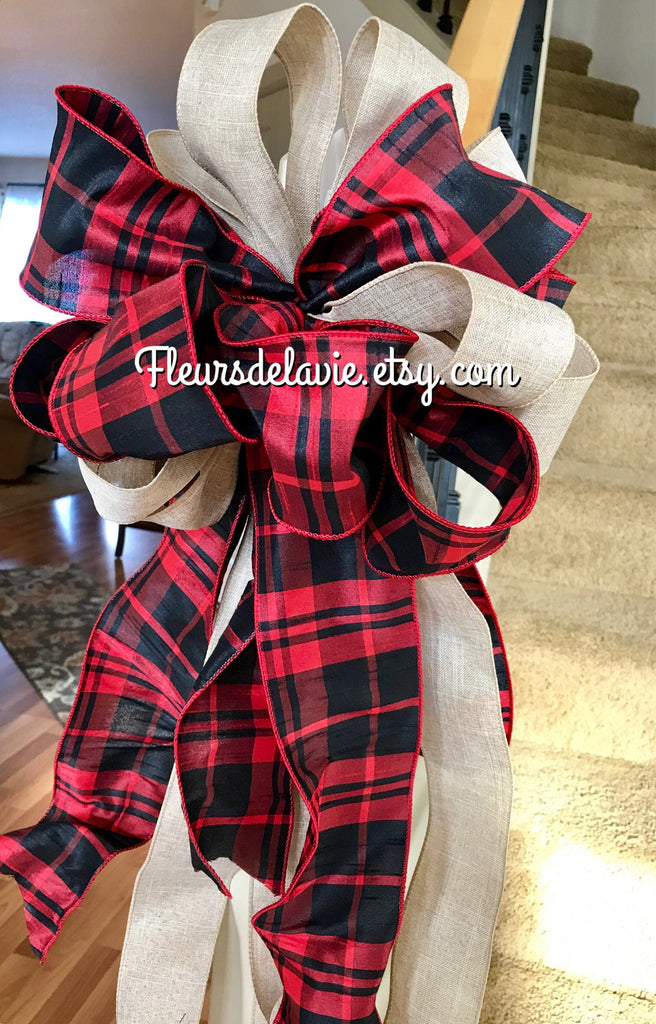 Made up with beautiful red and black plaid satin and natural faux Burlap ribbon.